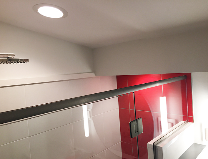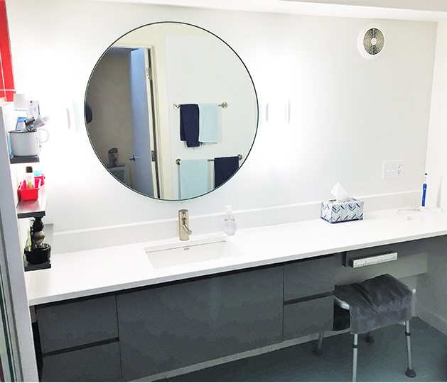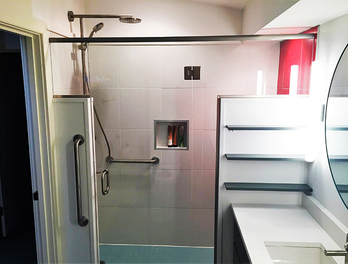 This bathroom, located in a beach house, is designed per universal design standards. Making it accessible for people with impairments does not need to look boring! The vivid colors and good lighting reflect the relaxed mood of a vacation home.